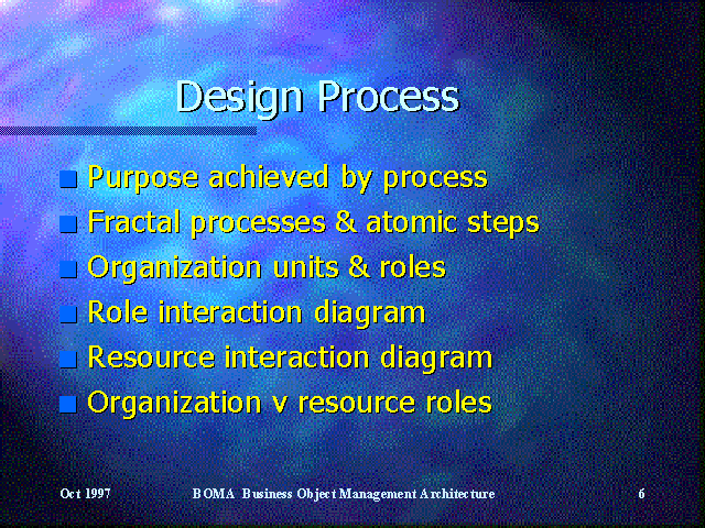 The process design process involves the analysis, definition, improvement, and implementation of business processes using the standard BOMA™ process notations and components.