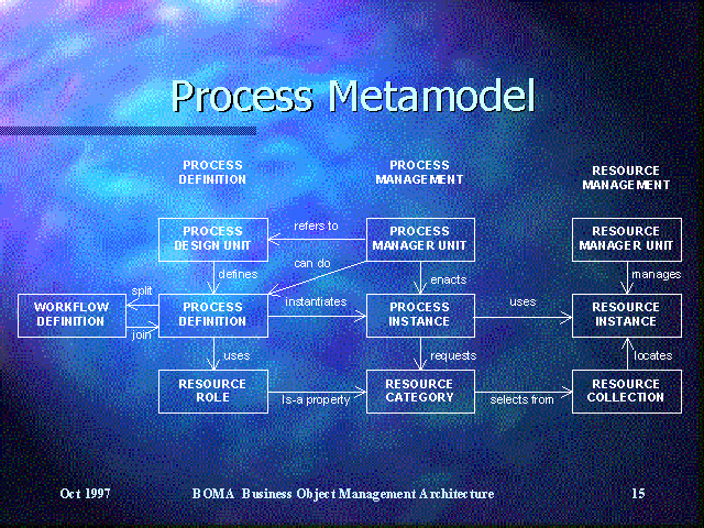 The BOMA process metamodel recognizes the separate domains of process definition, process management and resource management.