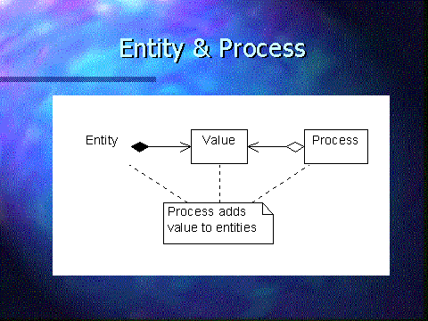 Value is used and created by business processes. This is a pattern typical of many process based systems, and helps to partition the aspects of an entity amongst different areas of interest. The concept of an organization role is used both to partition a process for workflow and security purposes, and to partition an entity for modeling purposes. Note that a process may interact with more than one entity value, some typically being preconditions or constraints (input values), others being objectives or goals (output values).